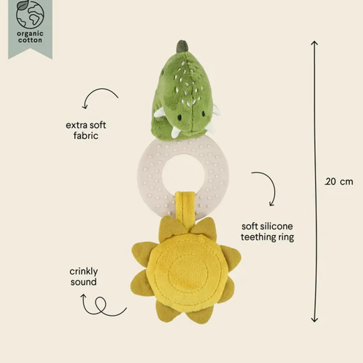Chunky and chewy, this friendly animal teething toy is perfect for comforting baby’s gums and brightening up their day. With its cuddly face, soft silicone teething ring and crinkly attachments, this colourful, grabbable toy will go everywhere they go.