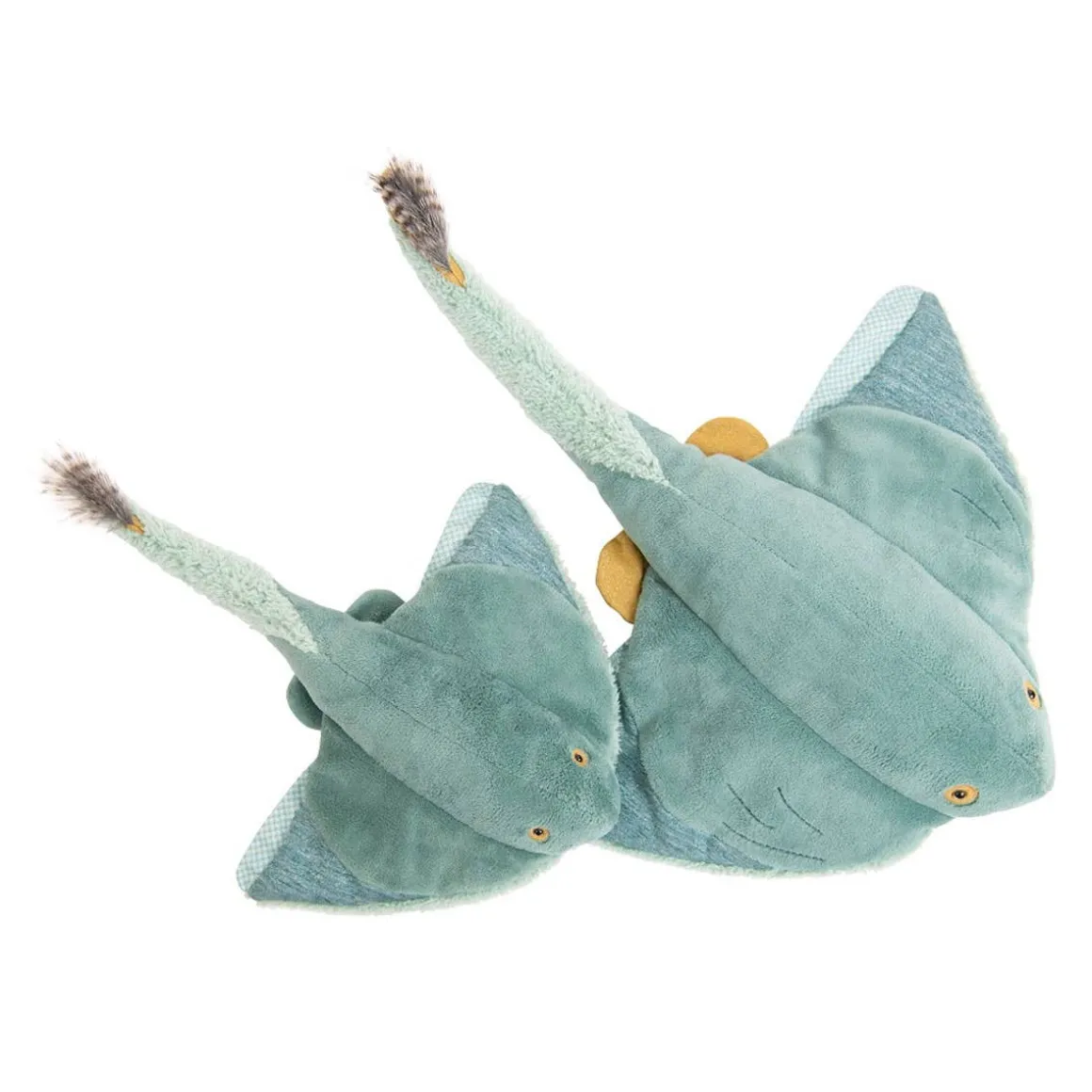 A large ray with amazing fins in a mix of patterned fabrics, copper thread and short and shaggy fur! A perfect cuddly friend with gentle eyes framed by golden thread—accompanied by its little ray.