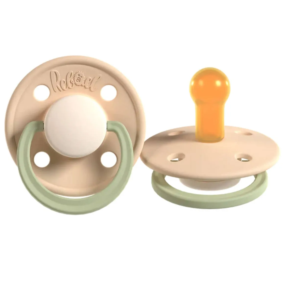 Rebael pacifiers with round nipple in 100% natural rubber latex, without added chemicals. Match each outfit with a pacifier from Rebael. Rebael pacifiers have a nipple made of natural rubber, also called natural rubber latex. In Rebael pacifiers, the natural rubber is allowed to dry naturally, without added chemicals. This means that the manufacturing process takes a little longer but provides cleaner, more durable and safer pacifiers.