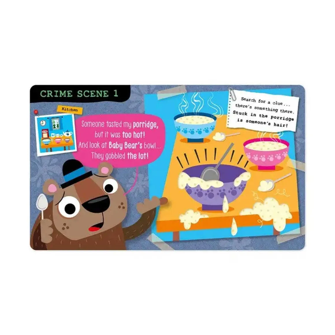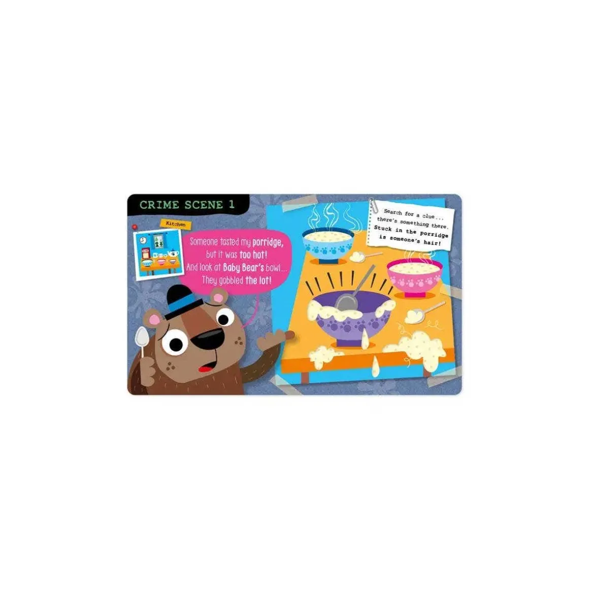 There’s a new mystery to solve in Fairy Tale Town! The Three Bears have returned home, and nothing seems to be “just right”. In this fun twist to the classic tale, children will love the interactive story time, pulling the sliders, opening flaps, and finding clues to solve the crime.
