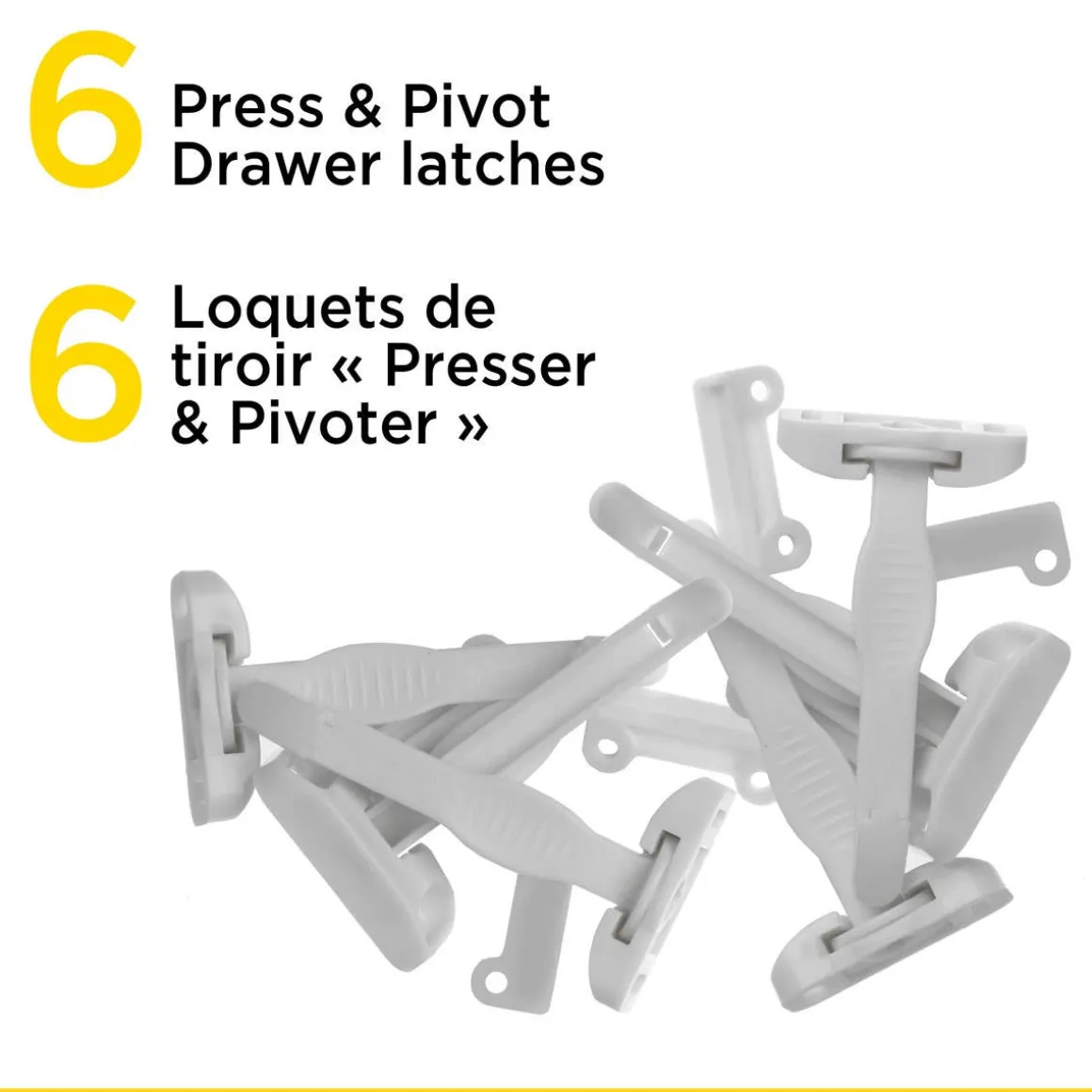 - 2 Cabinet Slide Locks, 6 Press & Pivot Drawer latches