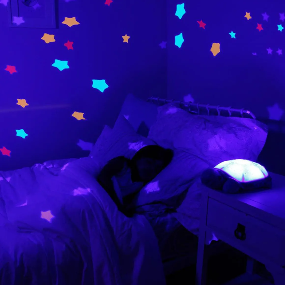 The Twinkling Twilight Turtle is a new spin on our original award winning Twilight Turtle! Now with 2 soothing MELODIES and 100’s of stars that “TWINKLE” on and off, the new Turtle projects several colorful star patterns on the ceiling and creates a multicolor light show on the shell.