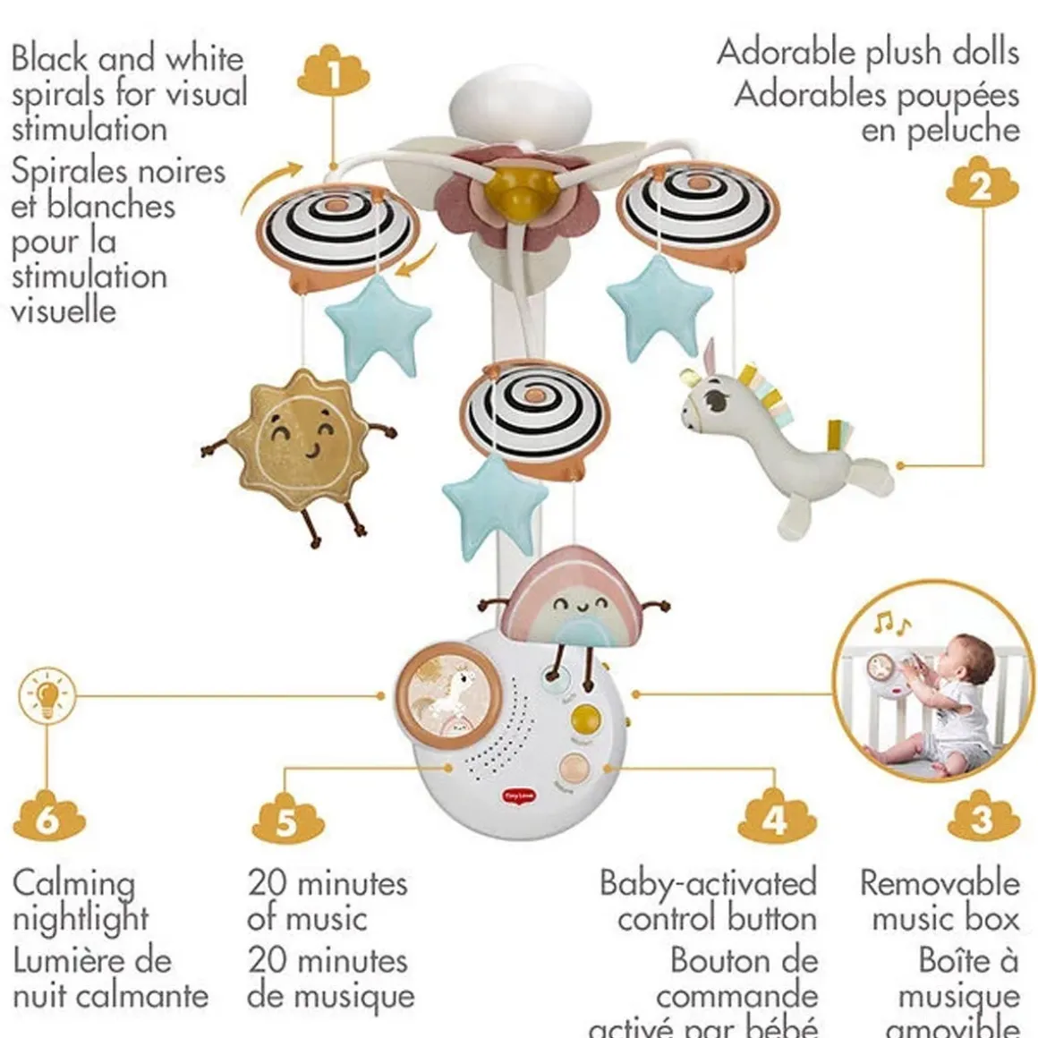 The Tiny Love Classic Mobile in the enchanting Unicorn Wonderlands design is the perfect toy to engage younger babies and help them feel safe and secure. This magical mobile entertains your baby for up to 20 minutes with soothing classical music and gentle lights, ideal for accompanying your little one into the relaxation phase.