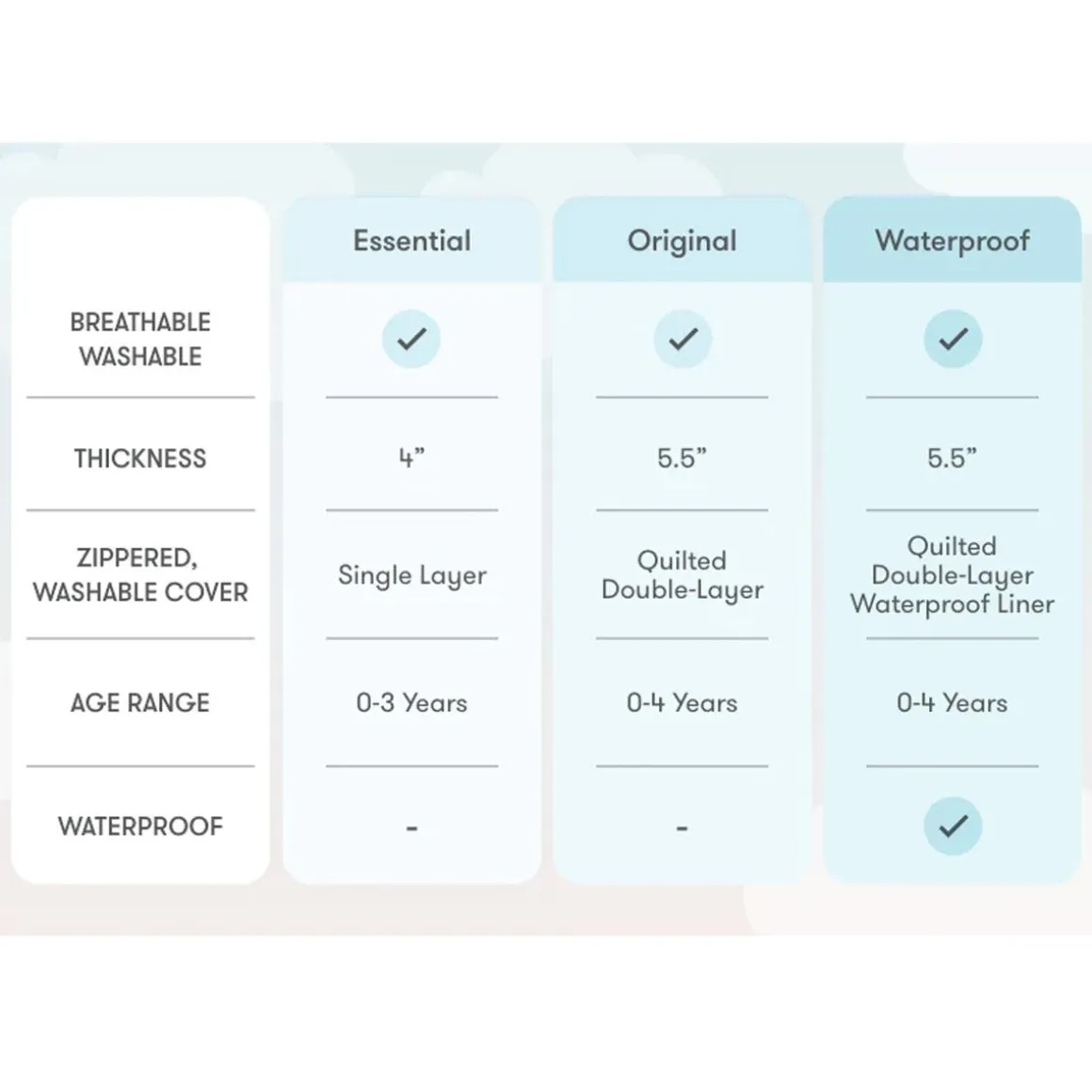 The Waterproof Crib Mattress (52″ x 28″ x 5.5″) fits all standard-size cribs. This is 100% breathable & washable with a waterproof lining on the toddler side, 5.5-inch thickness, and a soft, quilted removable cover.