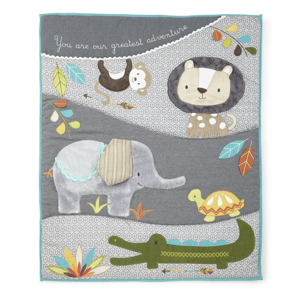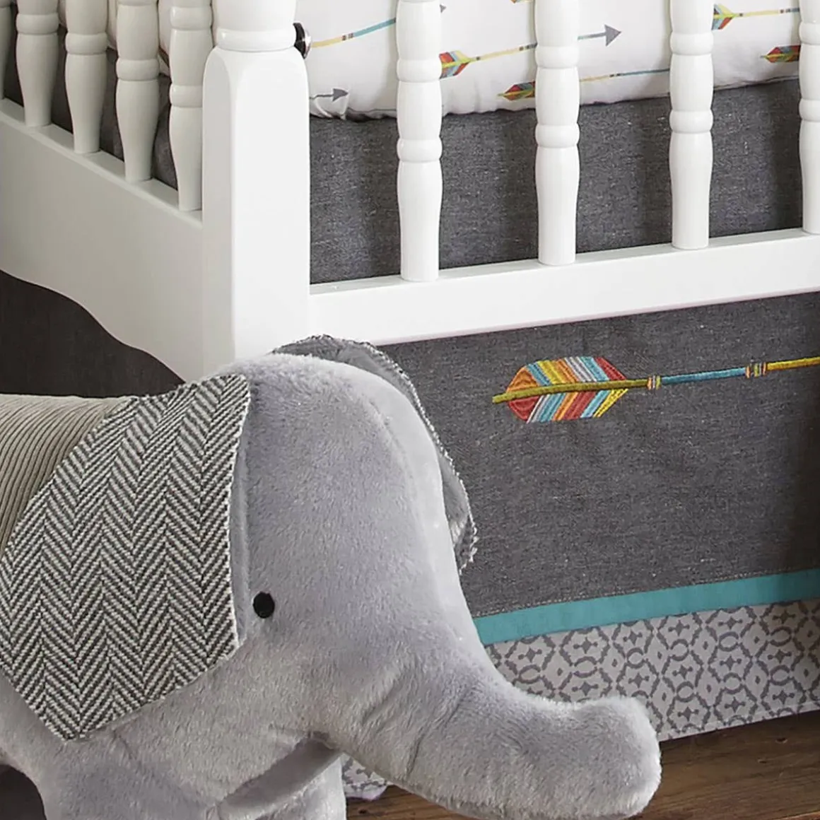 This cute collection includes a quilt, diaper stacker, fitted crib sheet, dust ruffle and wall decals to help set up your baby’s room.