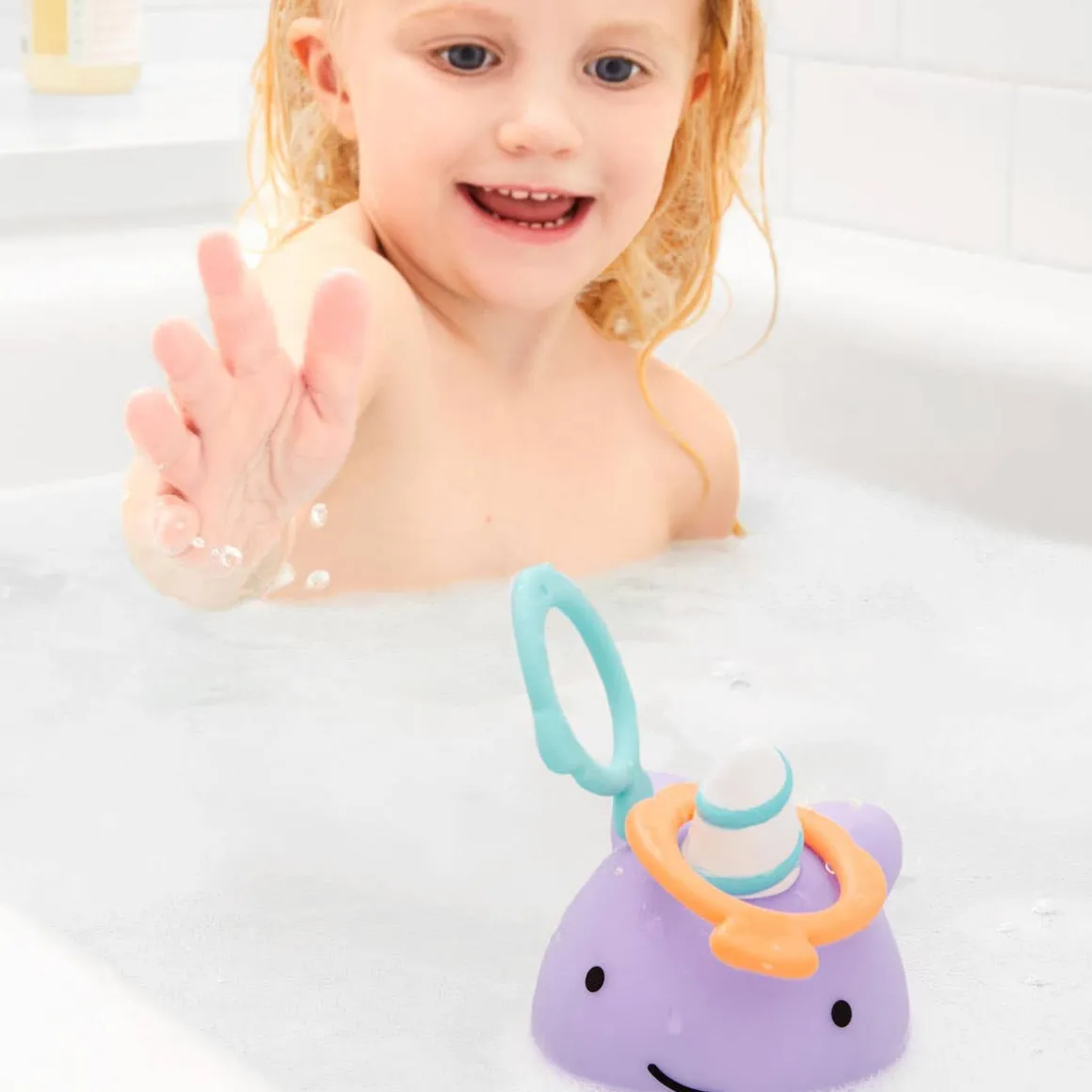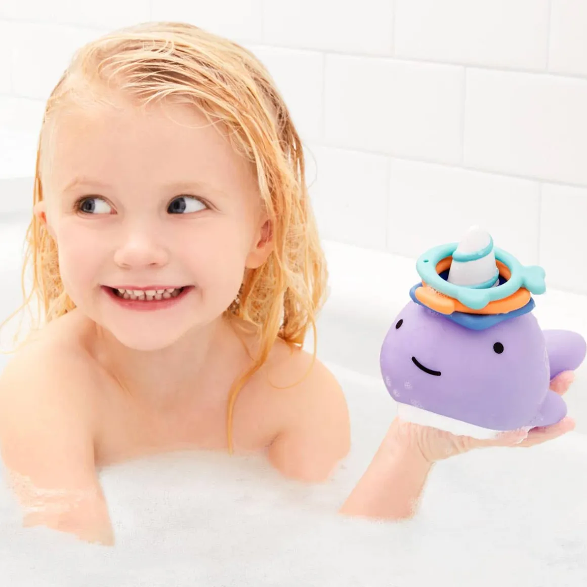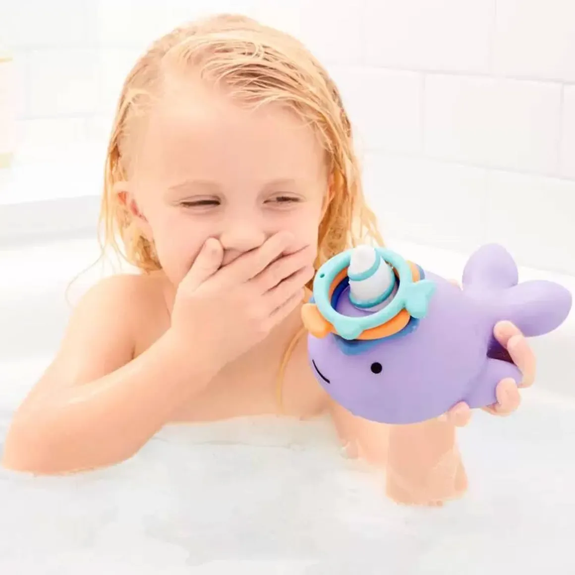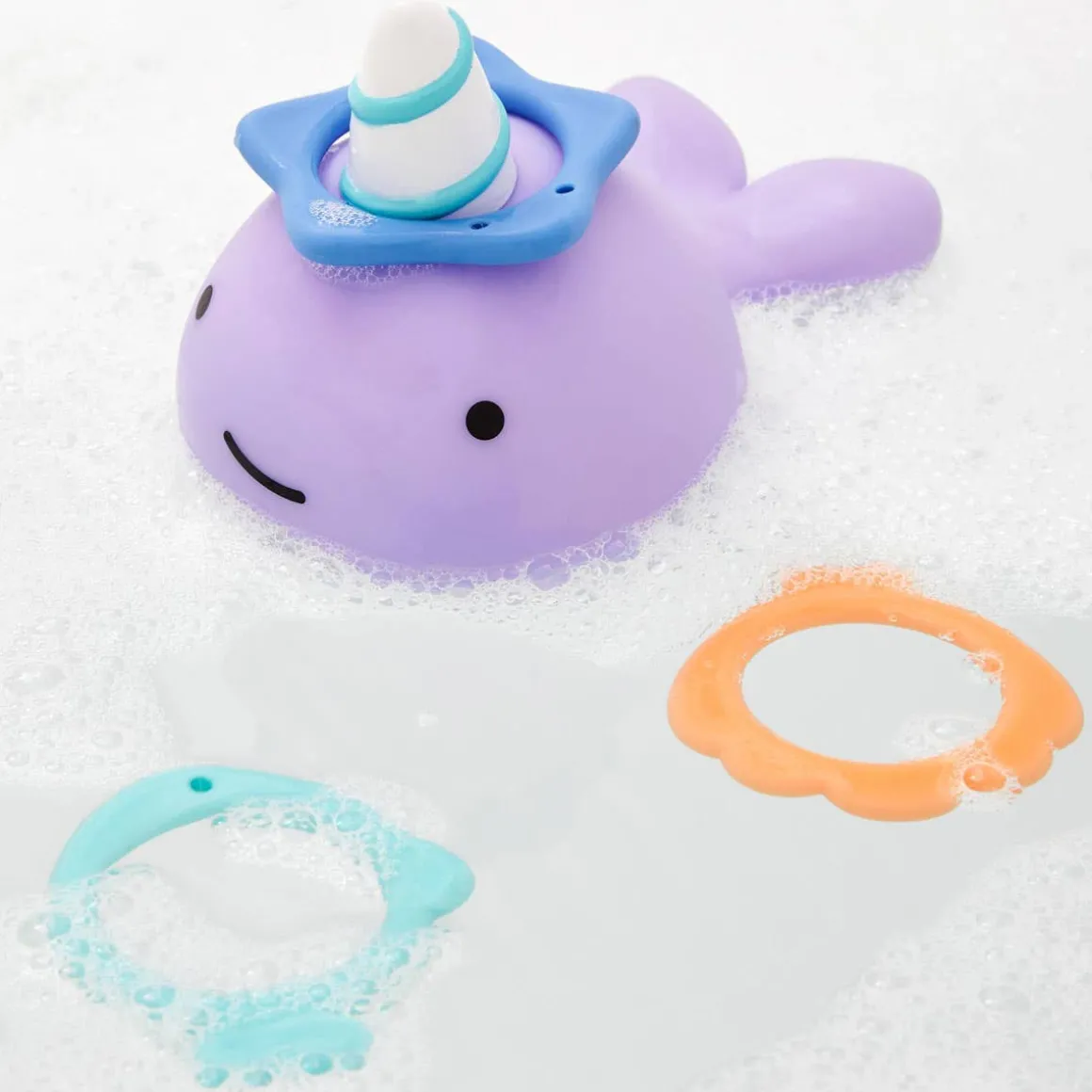 This tub time friend is ready to ring it on! Our adorable narwhal is all set for a game of catch with your little one. Just toss the rings onto its horn and score a splash of bathtime fun!