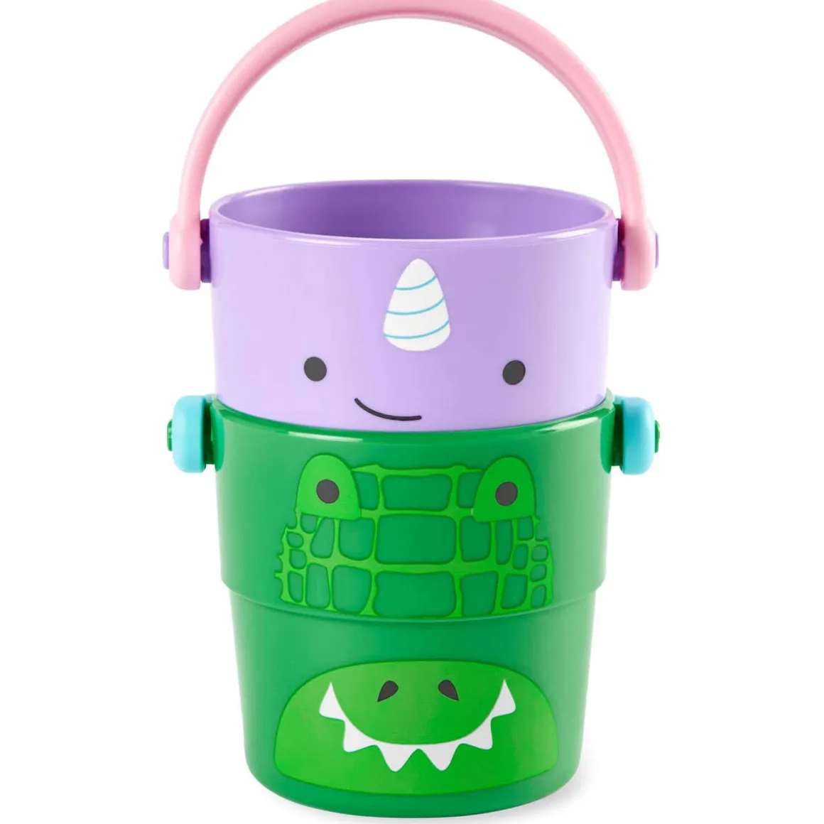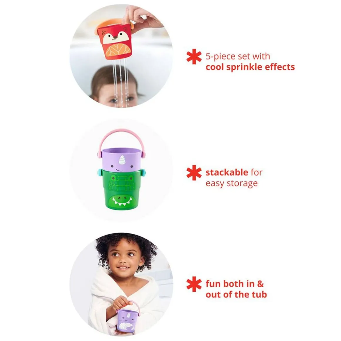 Skip hop friendly-faced nesting buckets feature three different sprinkle effects for bath time fun. Perfectly sized for little hands, these cute bath toys provide endless tub time play while helping to build motor skills. Kids can drain water in a variety of ways, then stack and store when tub time’s done. Your little ones will love to soak up the fun with our full line of ZOO® baby bath toys and bath toys for kids.