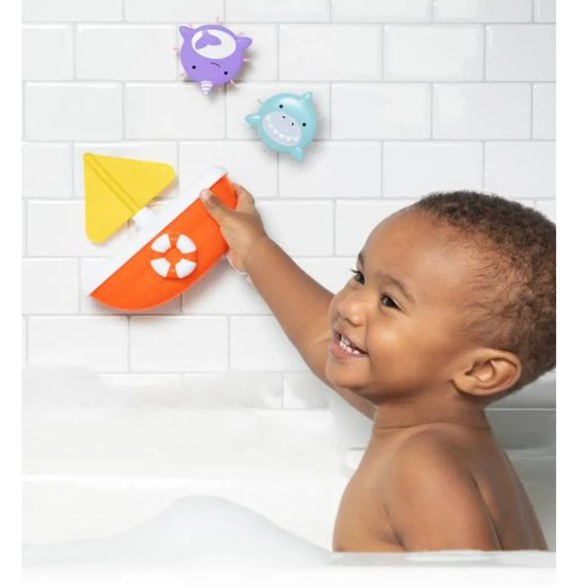 Sail into tub time fun with Skip Hop cute ZOO®️ bath toy. This tipsy-turvy boat plus shark and narwhal shipmates suction to the wall for an extra splash of fun. Pour water onto the boat to make it tip or pour over the characters and watch them spin.